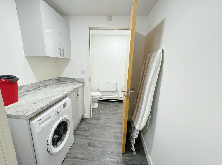 The modern fitted kitchen is fully equipped with double ovens, dual hobs, large fridge freezers, and ample storage and seating space. The property also includes an additional washroom conveniently located beside the living room, fitted with a washer and dryer.